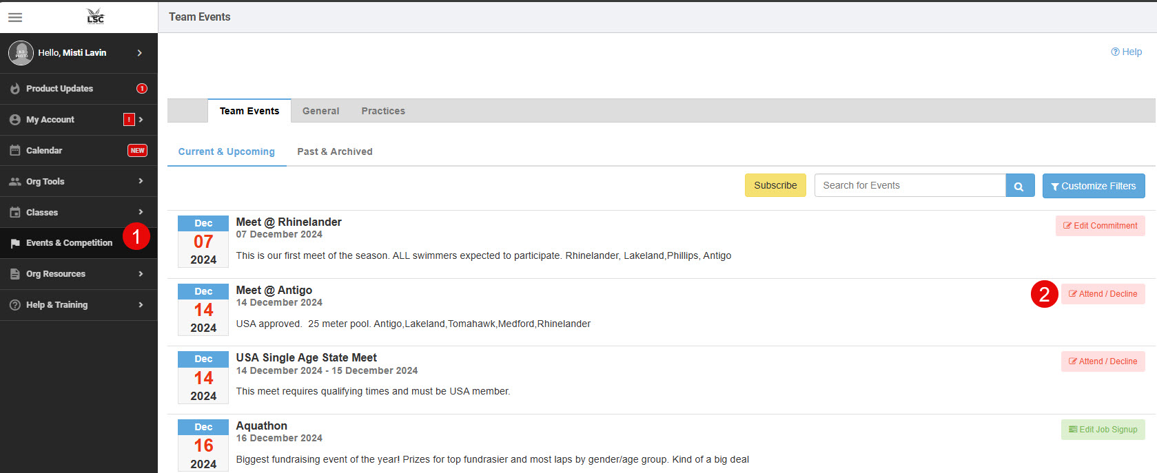 In the navigation bar, click Events & Competition. Under the Team Events Page, locate the meet you wish to RSVP and select Attend/ Decline