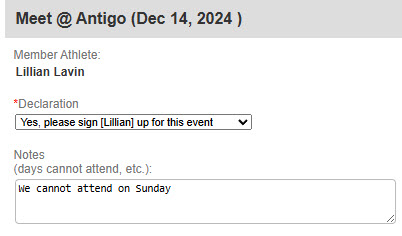 On the Athlete Signup Page, click your Swimmers Name. Then pick your Declaration and share any Notes